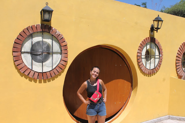 Vemos como esta turista pidió permiso para tomarse unas fotos en la casa Hobbit de Molinari.